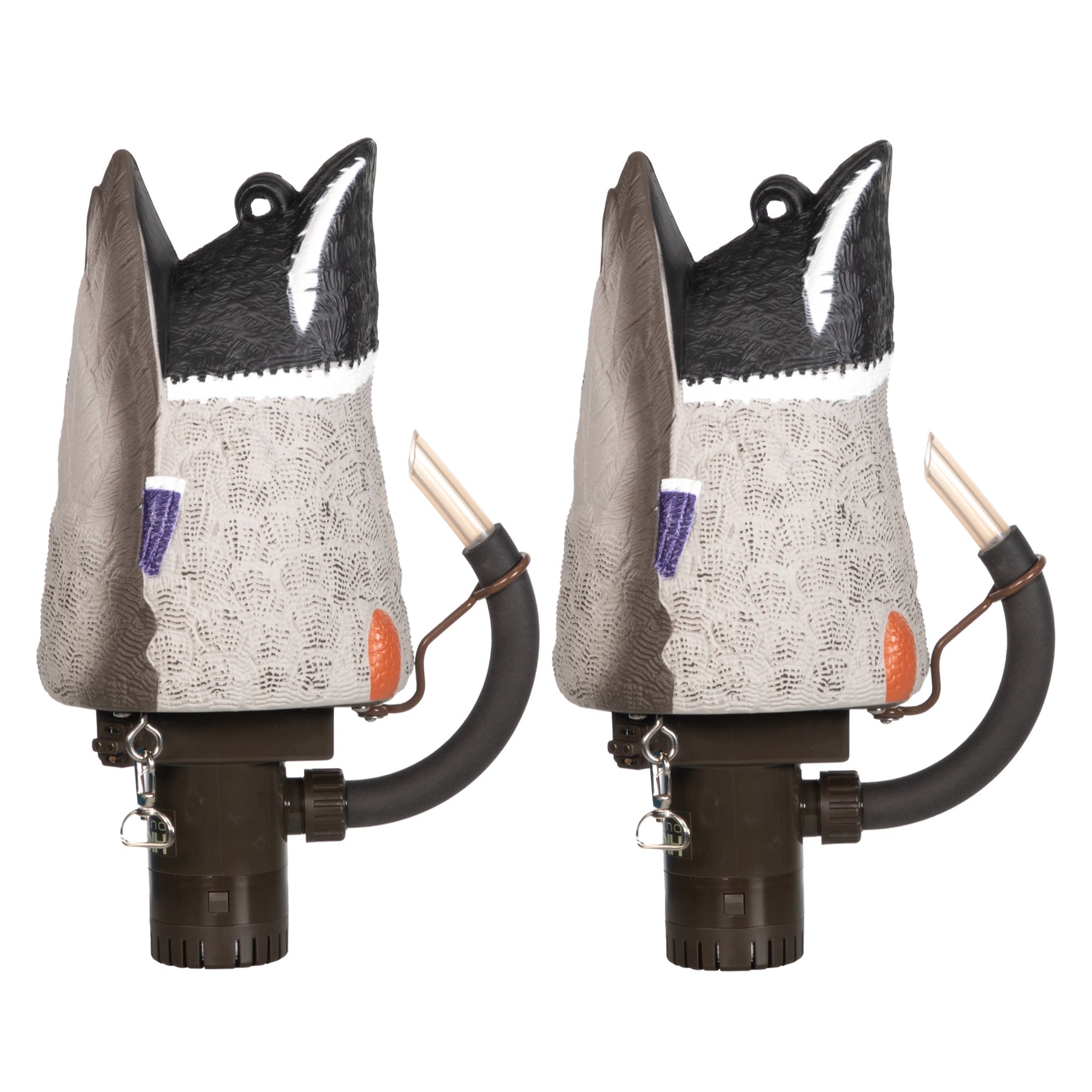 The Higdon Outdoors Pulsator PRO Mallard Drake and Hen Combo includes two lifelike water motion decoy heads with realistic feather patterns, each mounted on a dark base with hoses and tubes, positioned side by side and angled slightly apart.
