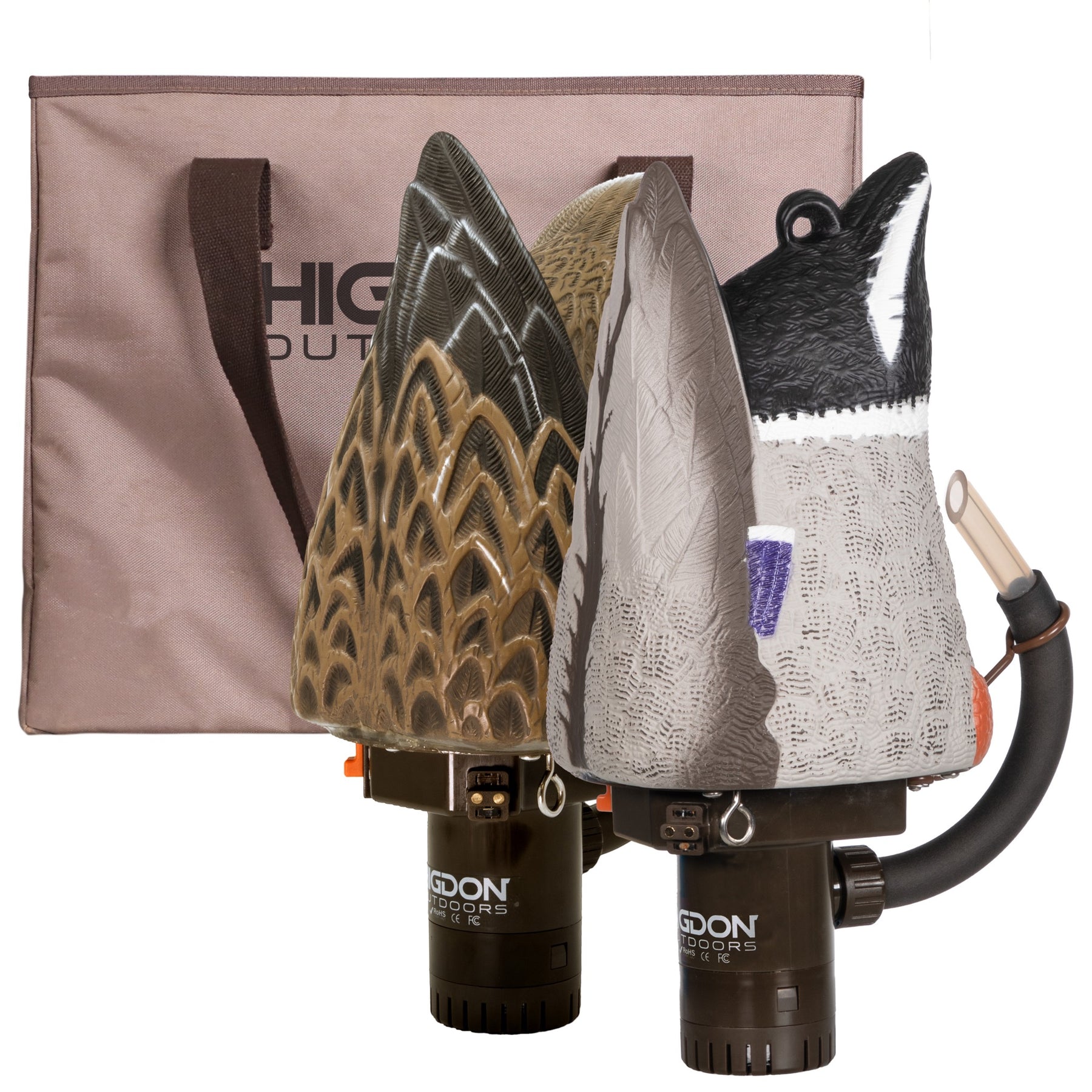 Two realistic duck decoy heads with brown and black feather patterns, mounted on Higdon Outdoors Pulsator PRO Mallard motion bases, are displayed in front of a tan bag with dark handles—perfect for upgrading your duck hunting equipment.